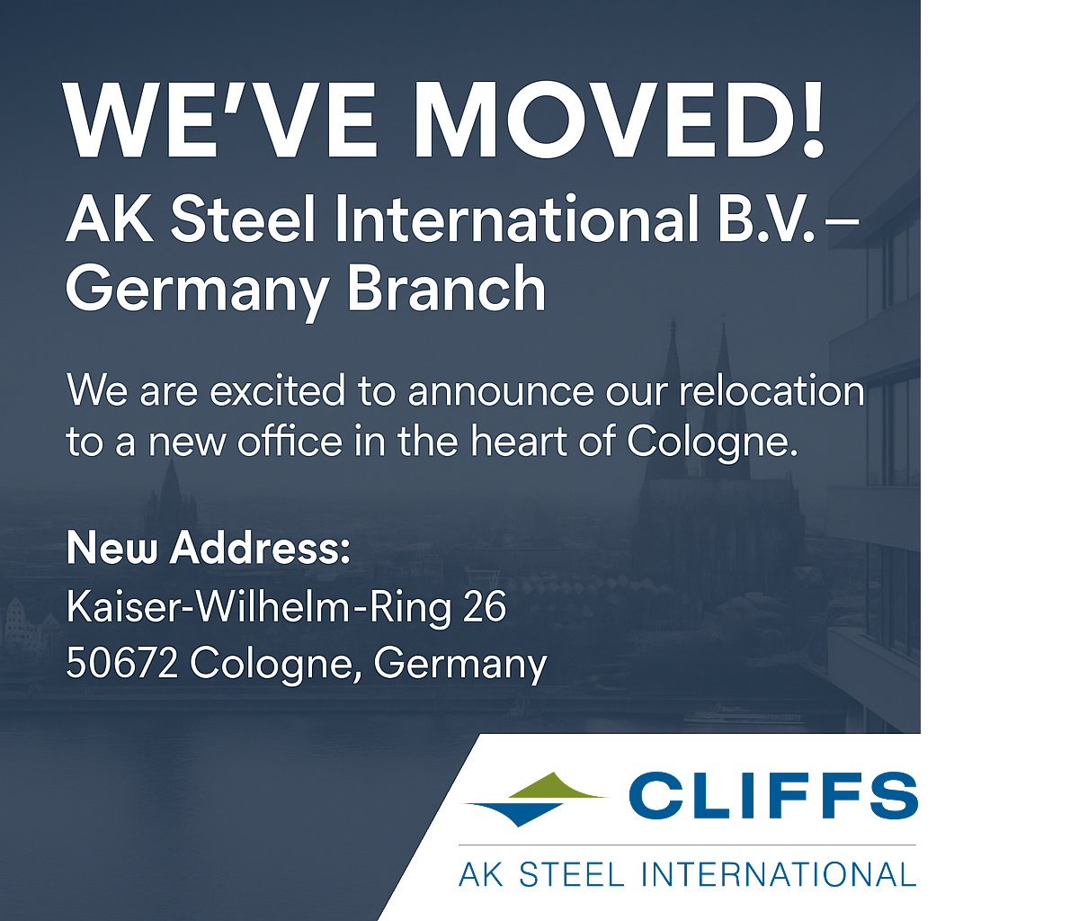 AK Steel International - ein führender Anbieter von hochwertigen Eisen- und Stahlprodukten – freut sich, den Umzug seiner deutschen Niederlassung an einen neuen, modernen Standort im Herzen von Köln bekannt zu geben. Dieser wichtige Schritt unterstreicht das kontinuierliche Engagement des Unternehmens für seine Kunden ausgehend von diesem Standort mit seiner fast 100-jährigen Firmengeschichte.