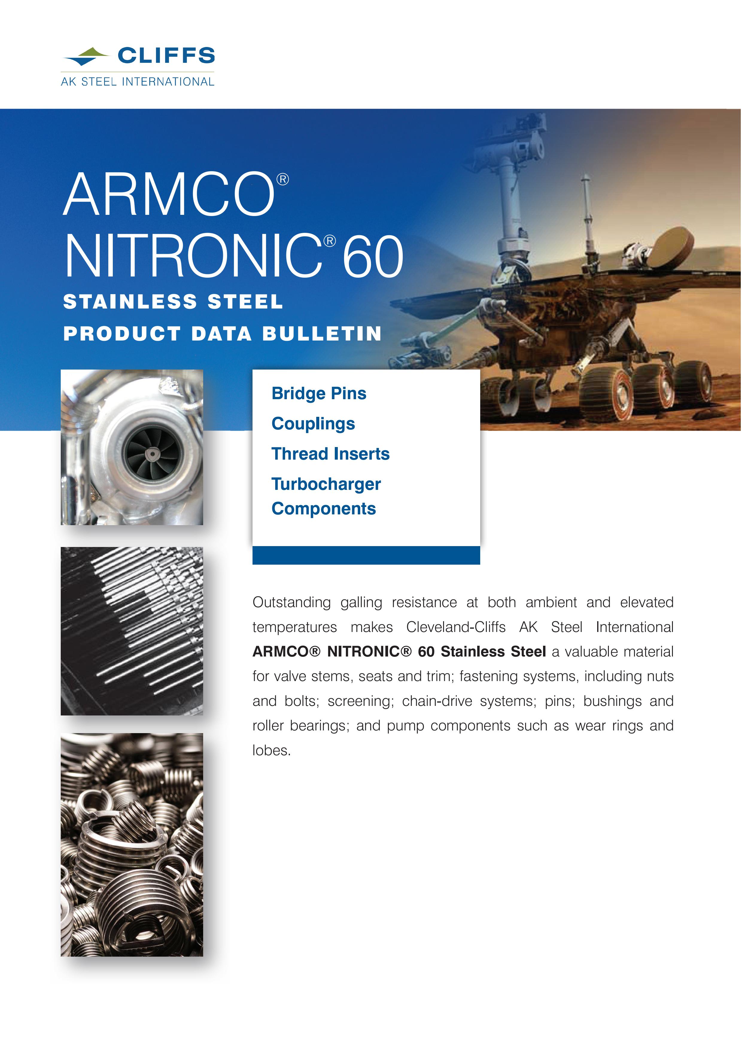 ARMCO® NITRONIC® 60 ist ein stickstoffgehärteter, austenitischer Edelstahl und einzigartig in seiner Beständigkeit gegen Kaltverschweißung (Galling), Abrieb, Reibkorrosion, Kavitationserosion und Hochtemperaturoxidation.